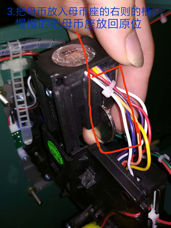 2.準(zhǔn)備好母幣(硬幣、游戲幣)放入母幣座的右側(cè)槽中,并慢慢把母幣座放回原處。