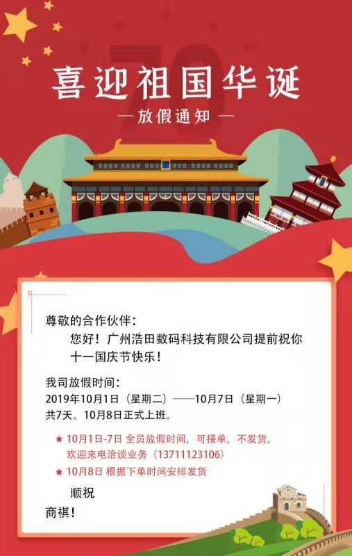 喜迎華誕70周年,2019浩田國慶假期通知