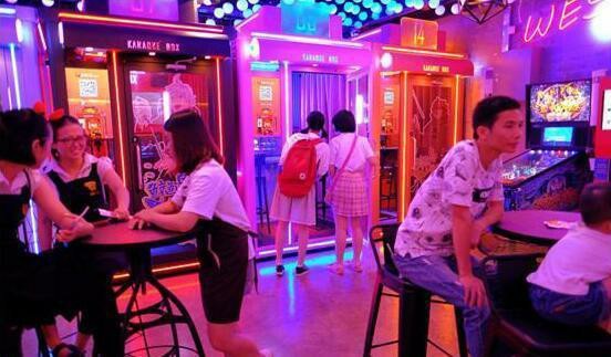 全民K歌在杭州開了第四家店自助K歌店。它由7間迷你KTV房、休閑娛樂區(qū)和休息區(qū)組成,占地約500平方米。其中,休閑娛樂區(qū)設有彈珠機、自助販售機、自助橙汁機等,頗為契合“自助”、“無人值守”的概念??瓷先ィ@和傳統(tǒng)KTV、迷你KTV都不太一樣。